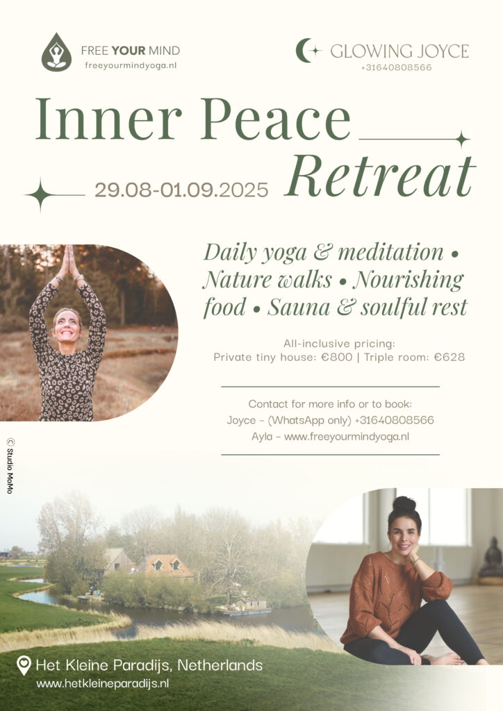 Wij kijken ernaar uit samen met jullie een prachtig en voedend weekend te beleven. De retraite is een extra lang weekend met drie nachten zodat er echt de tijd en ruimte is om tot rust te komen en volledig in de ervaring te zijn.